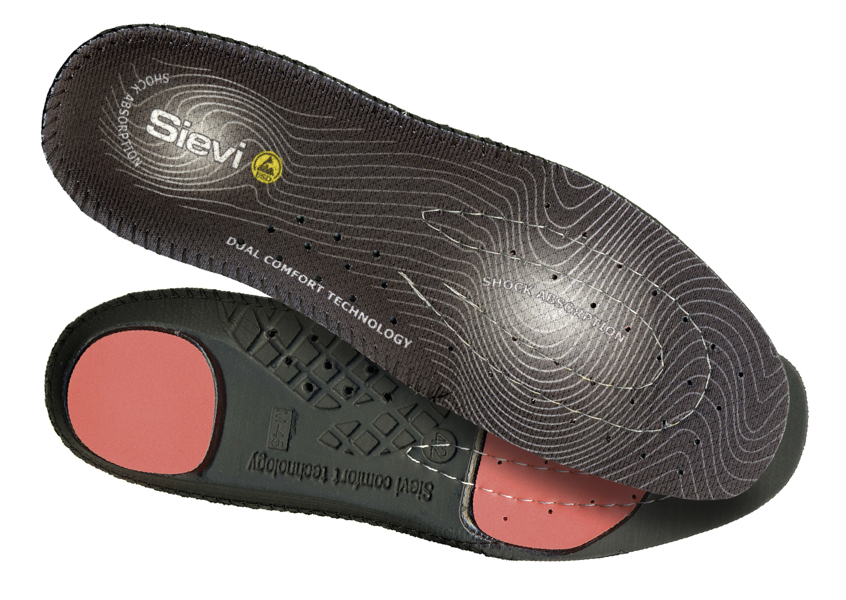Pohjallisissa on iskuja ja rasitusta vähentävä iskunvaimennustyyny sekä kantaosalla että päkiän alla. Iskunvaimennustyynyn materiaali PORON® on erittäin kestävää, ja pitää ominaisuutensa rikkoutumatta kovassakin päivittäisessä käytössä. Sievi Dual Comfort -pohjalliset ovat saatavilla sekä normaalilla lestin leveydellä että XL-laajuudessa. Pohjallinen täyttää ESD-normit. Pestään käsin.
