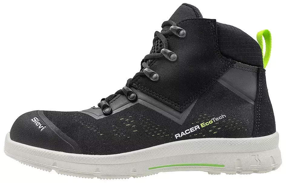Racer EcoTech H nilkkureissa on maksimoitu kierrätysmateriaalien käyttö. Turvajalkineissa on alumiinivarvassuoja ja tekstiilinaulasuoja. Päällinen on kudotun