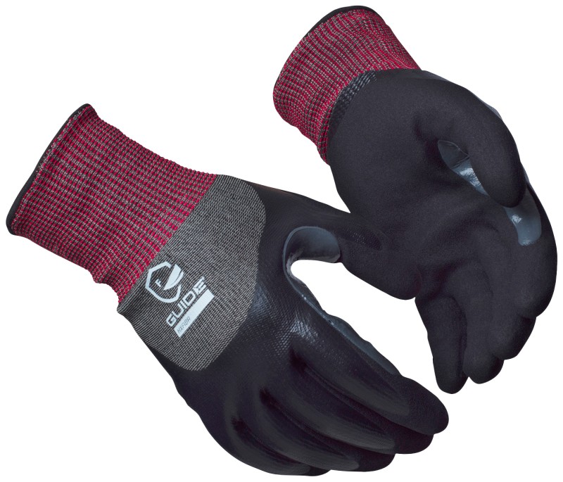 Guide 6607 tarjoaa sekä erittäin tehokkaan viiltosuojan että erinomaisen sormituntuman. Kämmenpuolella nestetiivis kokopinnoite nitriiliä, kämmenselkä pinnoitettu rystysiin asti. Viiltosuojataso F, kosketusnäyttötoiminto, tehokkaat vahvikkeet peukalossa ja etusormessa. Täyttää kontaktilämpövaatimukset, taso 1.