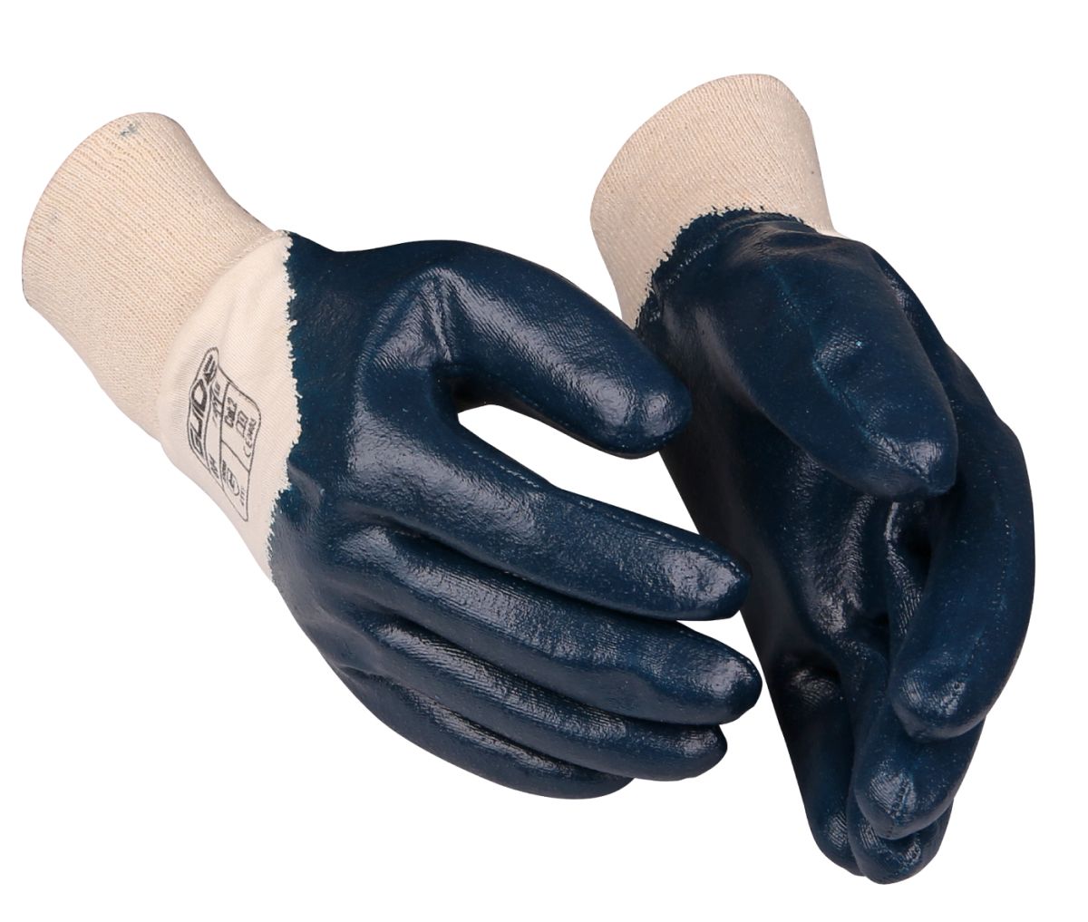 Vahva työkäsine nitriilillä Ohut puuvillavuori Neulottu resori Rystysiin asti pinnoitettu Hyvä pito kuivalla