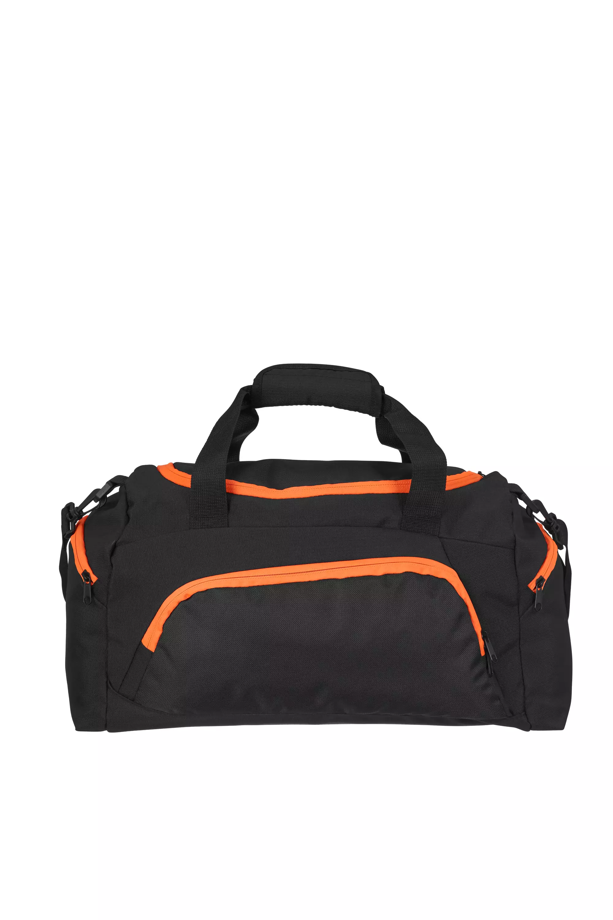 Kontrastiväreillä tyylitelty sporttikassi etutaskulla ja useilla sivutaskuilla. Pehmustettu kantokahva sekä säädettävä ja irroitettava olkaremmi. Tilavuus: n. 23 litraa