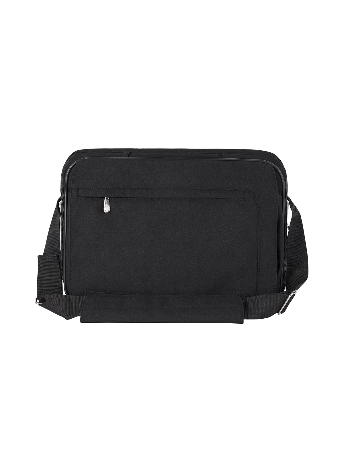 Tämä tietokonelaukku on suunniteltu niin, että voit pitää tietokonettasi laukun sisällä työskennellessäsi. Paksut vahvistukset suojaavat laukkua ja tekevät siitä tukevan. Leveät kantohihnat ja tukevat soljet. Mukana tulee ylimääräinen harmaa kantohihna. Laukussa on isot ulkotaskut edessä ja takana. Läpän alla tasku, jossa paperisi pysyvät hyvässä järjestyksessä. Magneettilukko. Laukku voidaan liittää trolleyyn. Materiaali: 100 % tvill-kangas. Mitat: 42x11x30 cm.