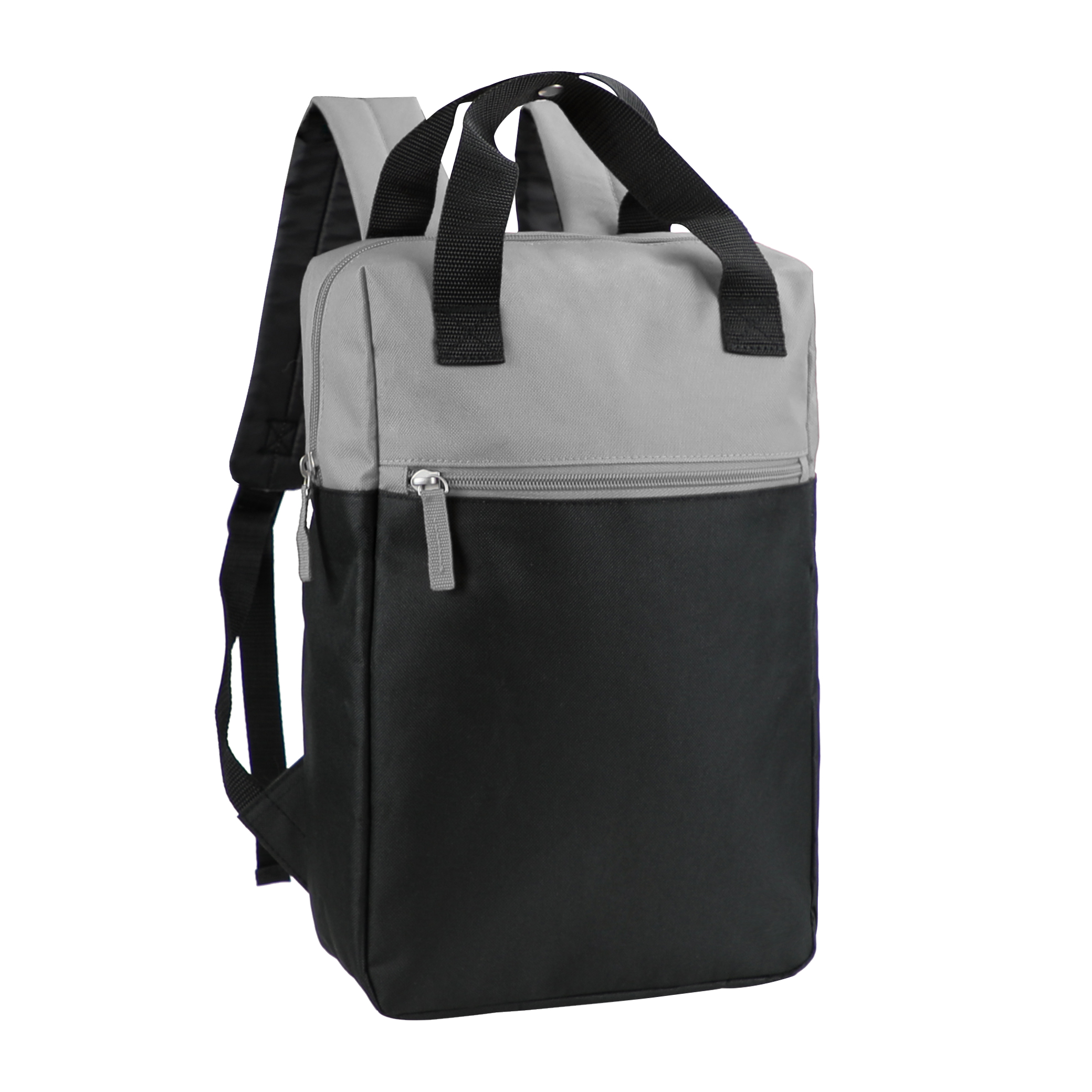 Kaksivärinen reppu isolla päätaskulla. Pehmustettu takaosa ja olkahihnat. Kaksi kantokahvaa painonappikiinnityksellä. Edessä vetoketjutasku. Sopii hyvin töihin ja vapaa-aikaan.