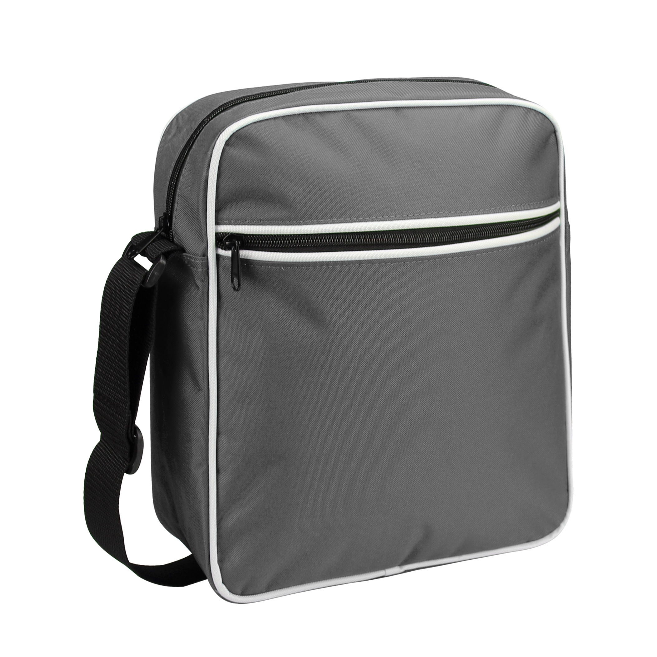 Retrohenkinen olkalaukku, jossa valkoiset tehoste tereet. Laukun materiaali on valmistettu kierrätetyistä PET-juomapulloista. Materiaali suojaa hyvin kosteudelta ja vesisateelta. Edessä pienempi vetoketjutasku. Säädettävä kantohihna. Laukku sopii hyvin vapaa-aikaan tai matkalle.