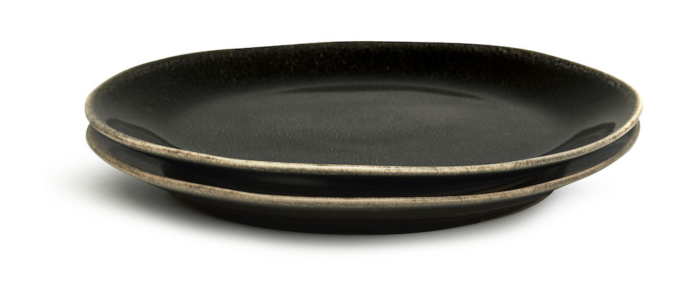Kaksi tummanharmaata keramiikkalautasta, joiden kaunis reaktiivinen lasitus tekee jokaisesta lautasesta ainutlaatuisen. Kestää konepesua, mikroa ja jopa 220 °C:n uuninlämpöä.