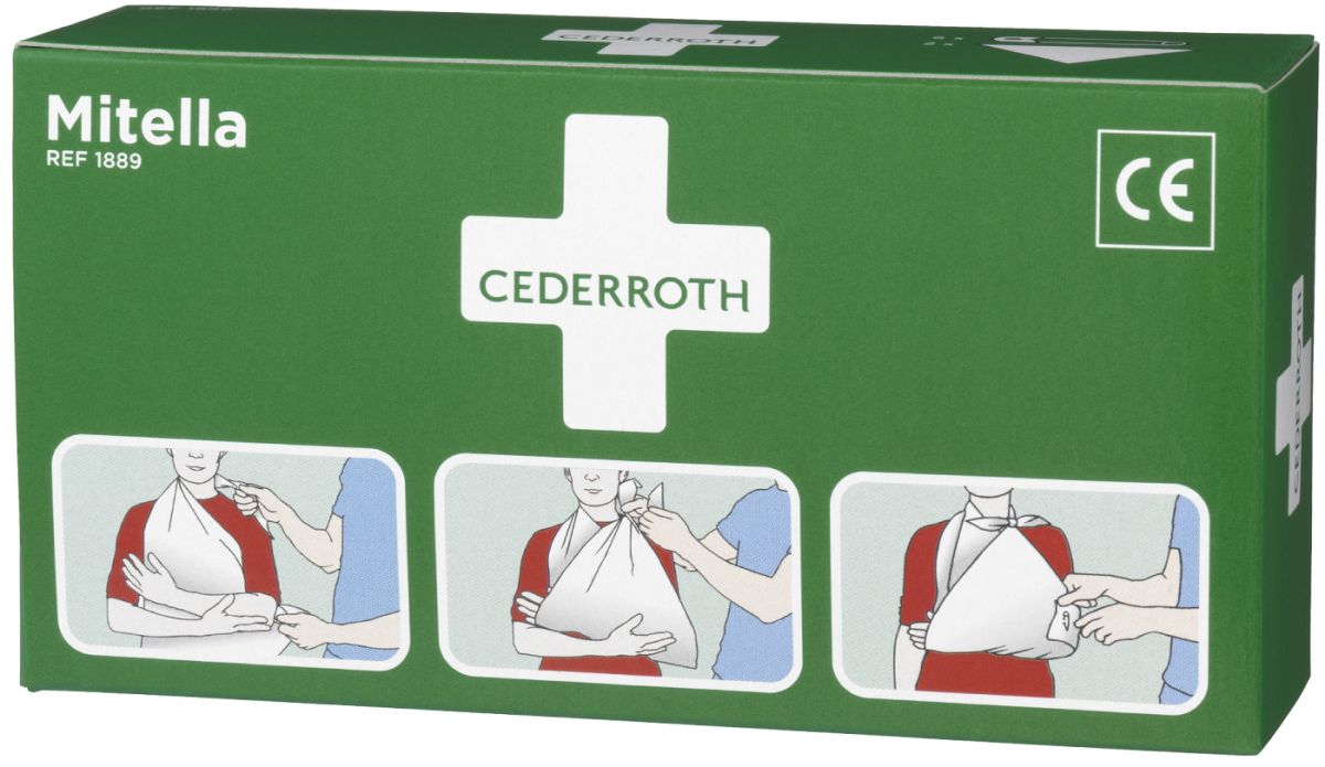 Cederroth kolmioliina kierretään niskan takaa kannattamaan loukkaantunutta käsivartta. Voidaan käyttää myös haavasiteen kiinnittämiseen. Koko 96 x 96 x 136 mm.