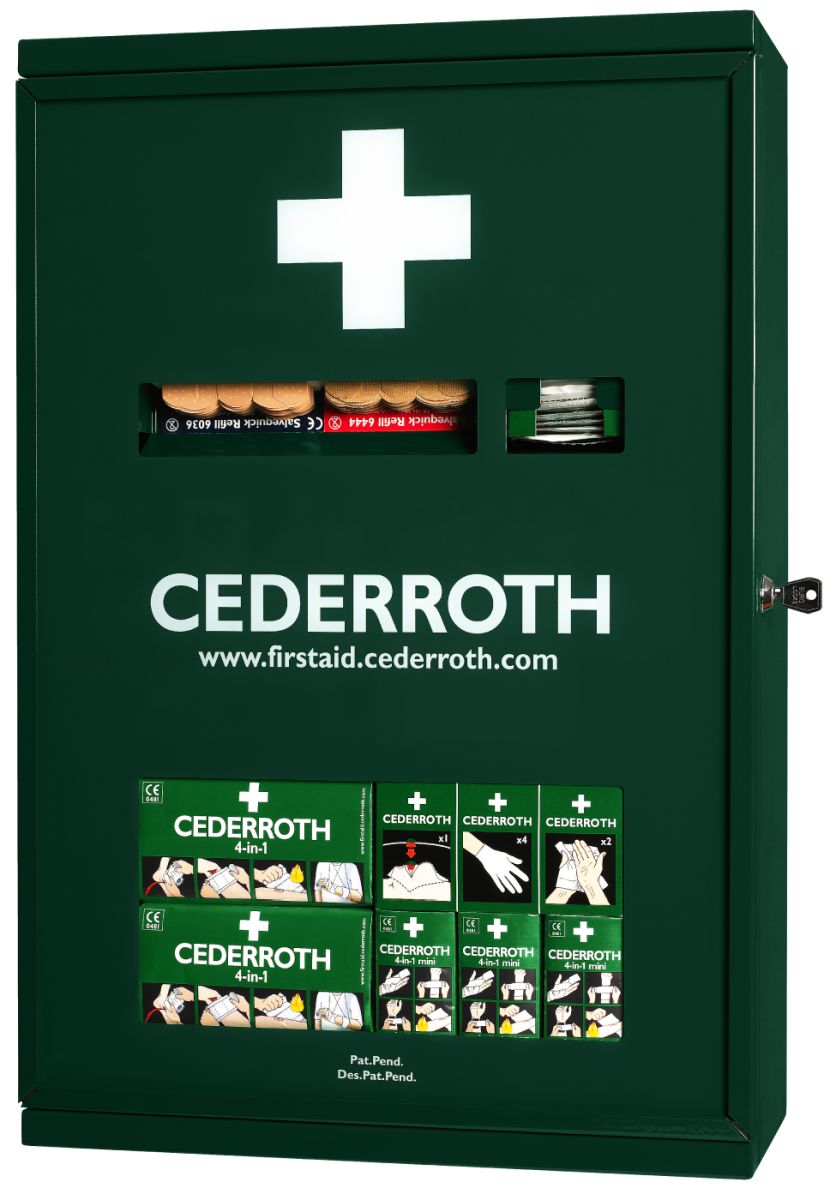 Lukittava kaappi vahvaa vihreäksi maalattua metallilevyä. Metallinen ensiapukaappi Cederrothin haavanhoitopisteellä on ehdoton hankinta jokaiselle työpaikalle. Lukittava tila täyttöpakkauksille... Lue lisää