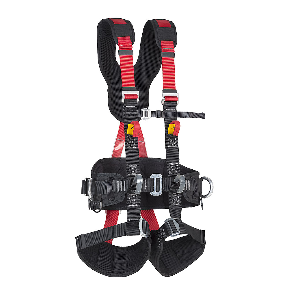 Leveät pehmusteet jalkareimmeissä, jotka tuovat mukavuutta köysien varassa työskentelyyn.
