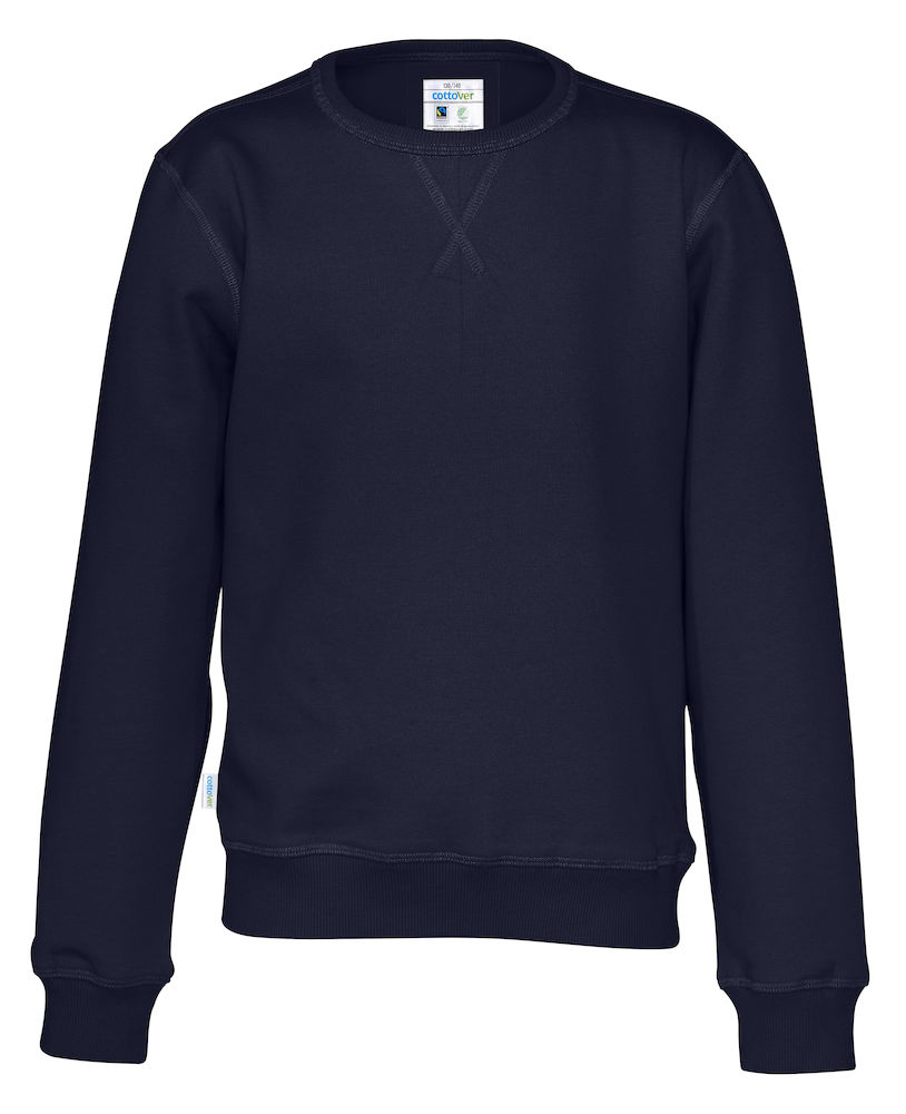 Lasten pyöreäkaula-aukkoinen collegepaita, jossa harjattu pehmeä sisäpuoli. 2x2-ribbineulos kaula-aukossa, hihansuissa ja helmassa. Saumurilla ommellut koristetikkaukset sävy sävyyn paidan kanssa.