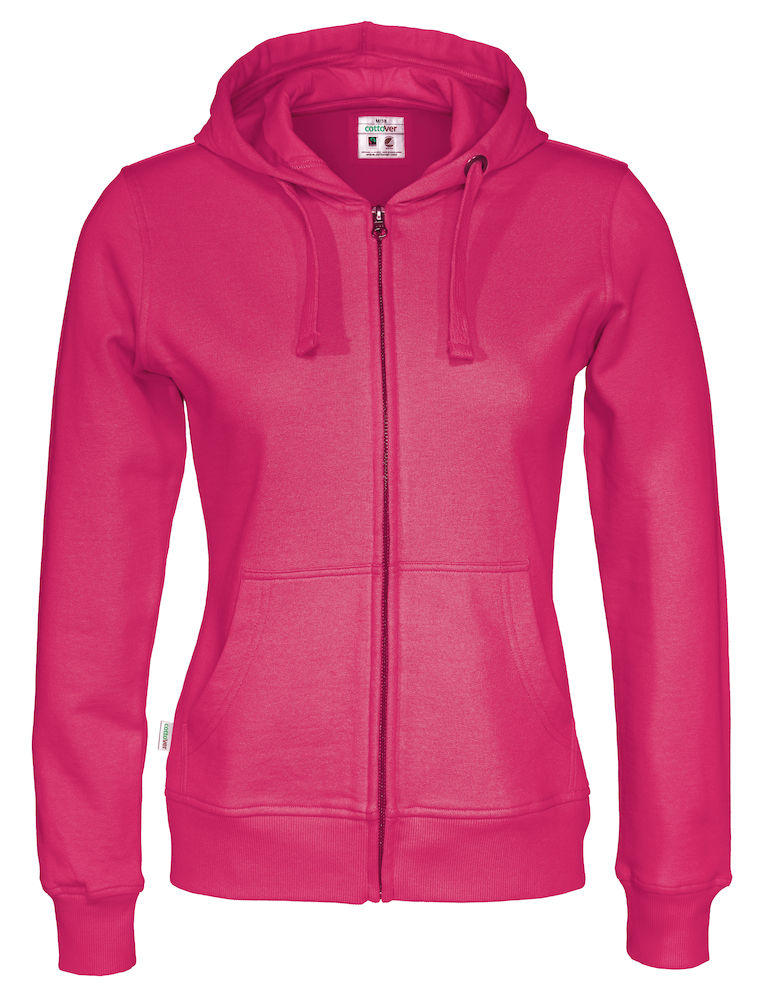 Naisten vetoketjuhuppari, jossa harjattu pehmeä sisäpuoli. Kavennettu hupullinen malli, jossa vahva vetoketju vankalla vetimellä. Kaksi etutaskua ja 2x2-ribbineulos hihansuissa sekä paidan helmassa. Värit: valkoinen 100, l.valkoinen 105, keltainen 255, oranssi 290, pinkki 425, cerise 435, punainen 460, vihreä 645, taivaansininen 725, royal 767, navy 855, violetti 885, antrasiitti 980, musta 990