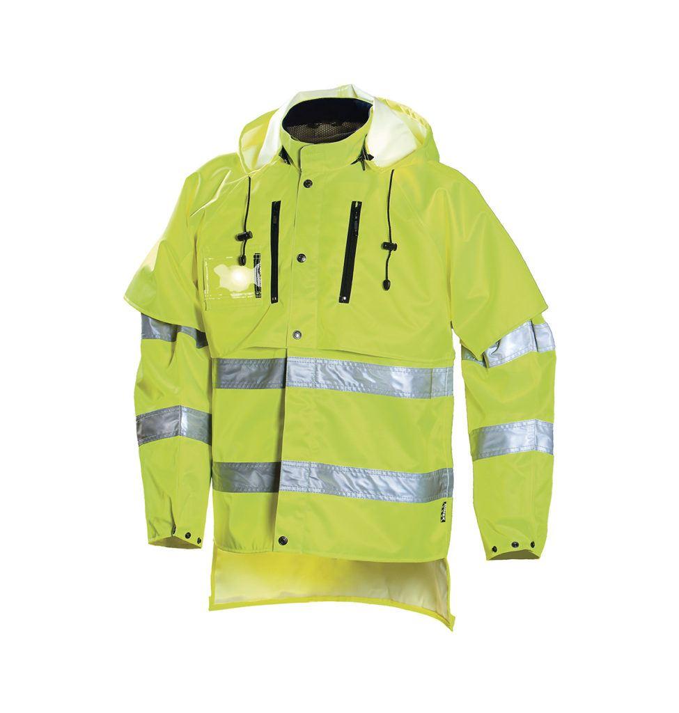 Vedenpitävä, teipatut saumat. Verkkovuori. Vetoketjutaskut ja vaaka henkilökorttitasku. Vetoketjulliset rintataskut. Neppareilla säädettävä hihansuu. Tuuletusaukot. Takahelmassa vesiura. Irrotettava huppu vetoketjukiinnityksellä. Nyörillä säädettävä huppu. Heijastimet 50 mm. Etulista.