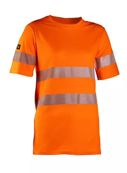 Naisten T-paita, joka tuntuu ja näyttää hyvältä päällä. Oranssi huomioväri ja painetut heijastimet lisäävät näkyvyyttä työmailla. Tämä oranssi työpaita täyttää näkyvyyssertifikaatin 2-luokassa.