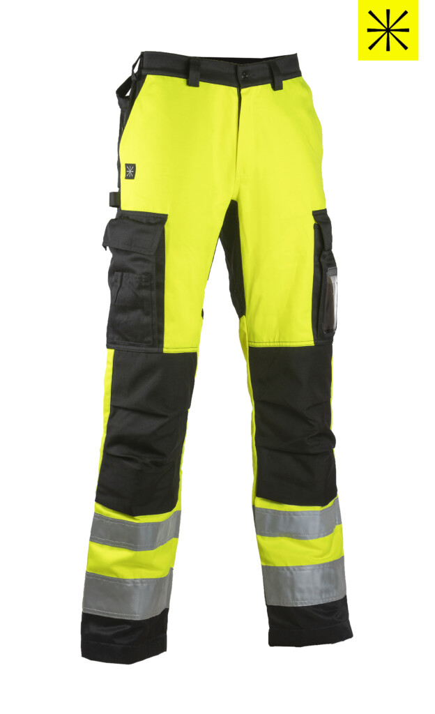 Uusi tyylitelty turvahousu näkyvyysluokkaan 1. Housut istuvat kivasti jalkaan, mutta ovat mukavat käyttää haarakiilan ja selkäpuolen joustavan vyötärökuminauhan ansiosta. Runsas tasku- ja lenkkivalikoima takaa että kaikille työvälineille on paikkansa.