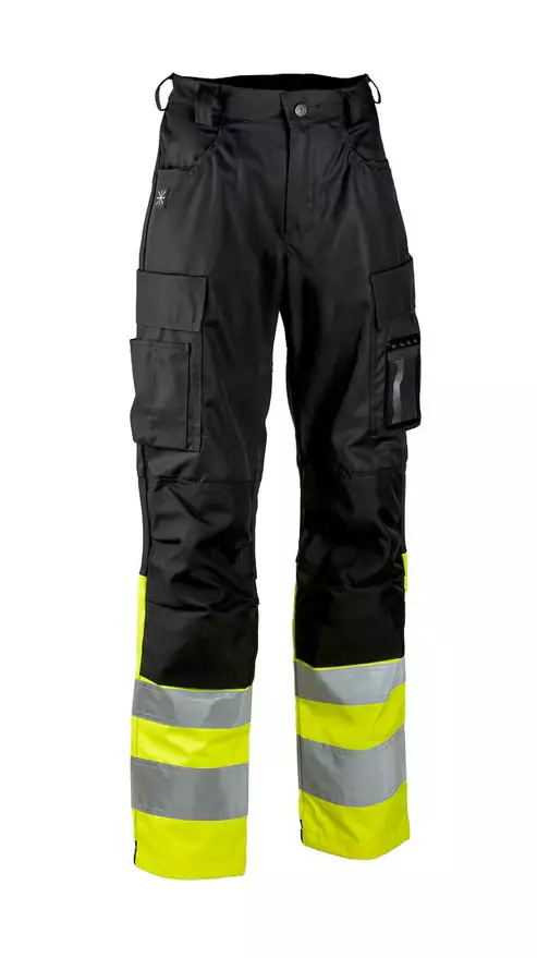 Naisten työhousut vettä ja likaa hylkivästä kierrätysmateriaalista. Joustavat paneelit housujen takaosassa ja polvitaipeessa lisäävät liikkuvuutta. Housuissa on polvisuojataskut kahden korkeuden säätövaralla. Käyttömukavuutta lisää kuminauha takana vyötäröllä.