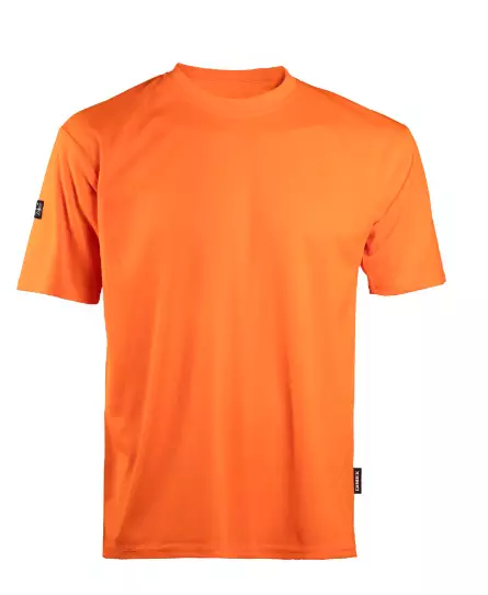 Huomiovärinen t-paita työhön tai vapaa-aikaan. Polyesterimateriaali tuntuu mukavalta ja kevyeltä käytössä sekä kuivuu nopeasti.