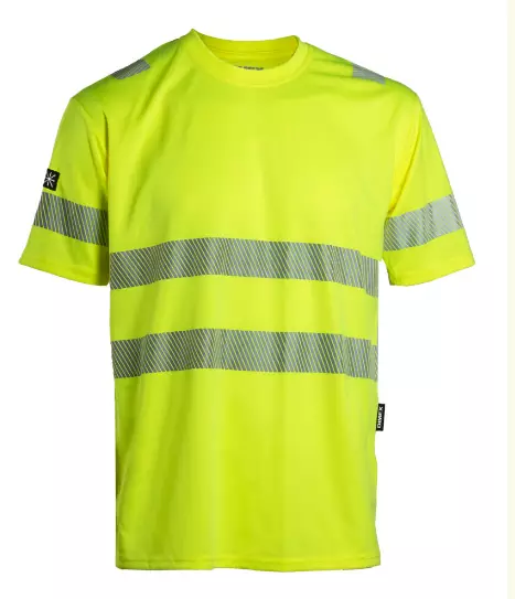 Huomiovärinen T-paita painetuilla heijastimilla. Mallissa myös olkaheijastimet. Kevyttä ja viileää polyesterimateriaalia.