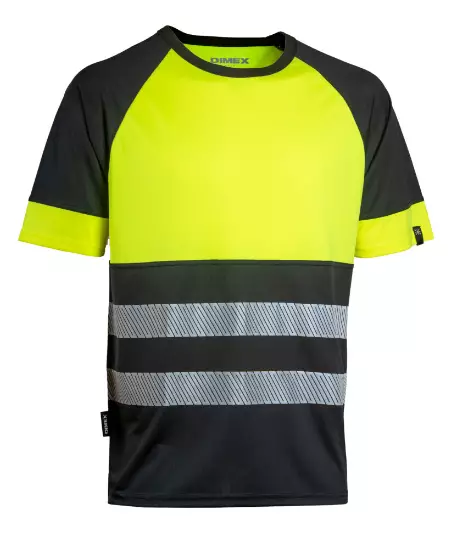 Huomiovärinen näkyvyysluokan 1 työpaita kevyestä materiaalista. Musta paidan helma on käytännöllinen työssä, jossa vaatteet likaantuvat helposti.