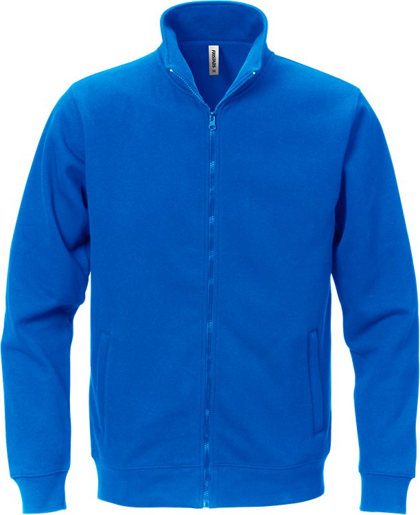 Collegetakki, jossa kokopitkä vetoketju ja vetoketjulliset etutaskut. Materiaali: 80 % puuvilla, 20 % polyesteri. Väri: Royalsininen (530)