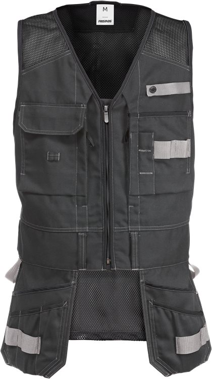 Klassinen säädettävä liivi, jossa selässä verkko tuuletusta varten. Edessä riippitaskut, jotka voi tarvittaessa kiinnittää piiloon.
