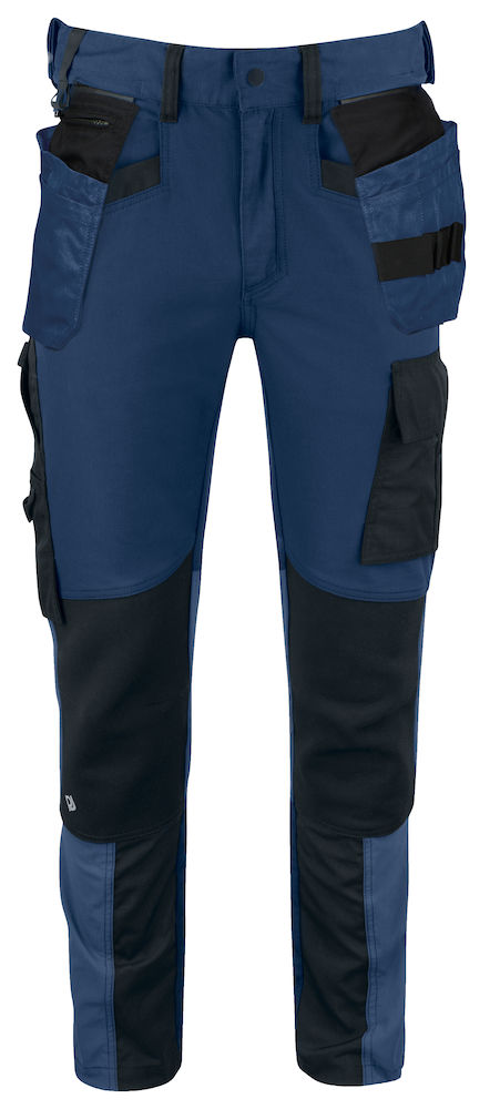 Joustavat työhousut mahdollistavat hyvän liikkuvuuden ja tuntuvat mukavilta päällä. Moderni leikkaus. Neljään suuntaan joustavaa materiaalia reisissä ja takamuksessa. Kahteen suuntaan joustavaa materiaalia polvitaipeissa ja lahkeiden alaosassa. Sivuissa vetoketjulliset tuuletusaukot. Myös vyötäröllä tuuletusaukko. Housuissa on reisitaskut, vasemmalla tasku työkaluille ja kynille, puhelintasku, jossa tarrakiinnitys, ja ID-korttipidike. Oikealla mittatasku ja puukkotasku, jossa puukkonappi. Kaksi vasaralenkkiä. Irrotettavissa riipputaskuissa ProJobin kehittämä piilokiinnitys. Mahdollisuus kiinnittää MOLLE-järjestelmä molemmille sivuille. Heijastavat yksityiskohdat parantavat näkyvyyttä. Säädettävät lahkeensuut. Muotoillut polvet. Sisäpuolella polvisuojataskut, jotka voidaan säätää kahdelle eri korkeudelle. Riipputaskuissa ja lahkeissa Cordura®-vahvikkeet ja polvissa joustavat kevlar-vahvikkeet, jotka lisäävät housujen kestävyyttä ja mukavuutta.