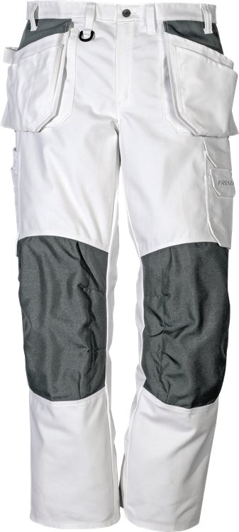 Mukavat ja monilla toiminnoilla varustetut työhousut kulutusta kestävää 100% puuvillaa, joka imee hyvin esim. maalia ja sopii siksi erinomaisesti maalareille.
