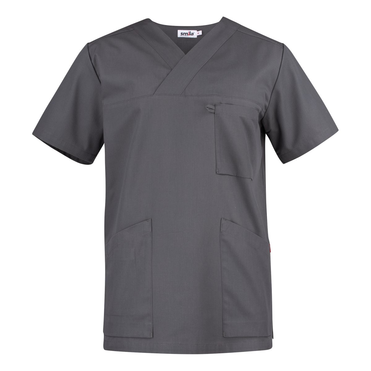 V-aukkoinen unisex-tunika. Suora ja mukava malli. Edessä tilavat päällitaskut, joista toisessa avainpidike. Rintataskussa korttipidike. Tilava malli, jossa on kokojen välillä tavallista suurempi ero. Takapituus 74 cm koossa M.