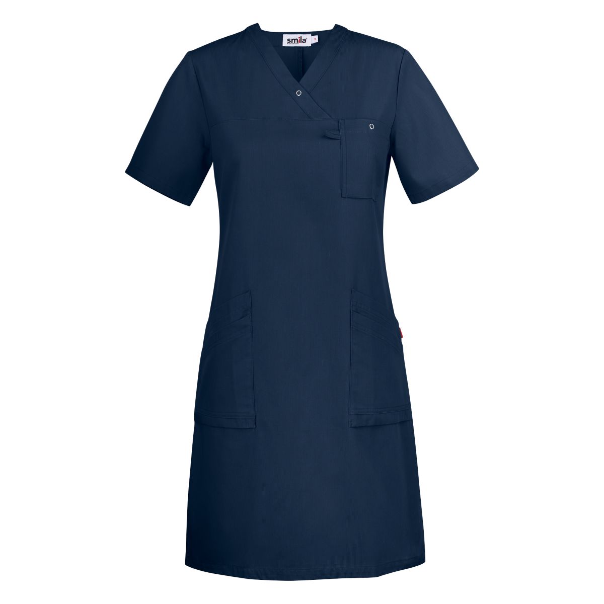 Kevyesti vartalonmyötäinen mekko, jossa V-pääntie. Edessä kaksi viistotaskua, joista toisessa avain-/korttipidike sekä rintatasku. V-pääntiessä rengas painonappi. Takapituus 100 cm koossa M.
