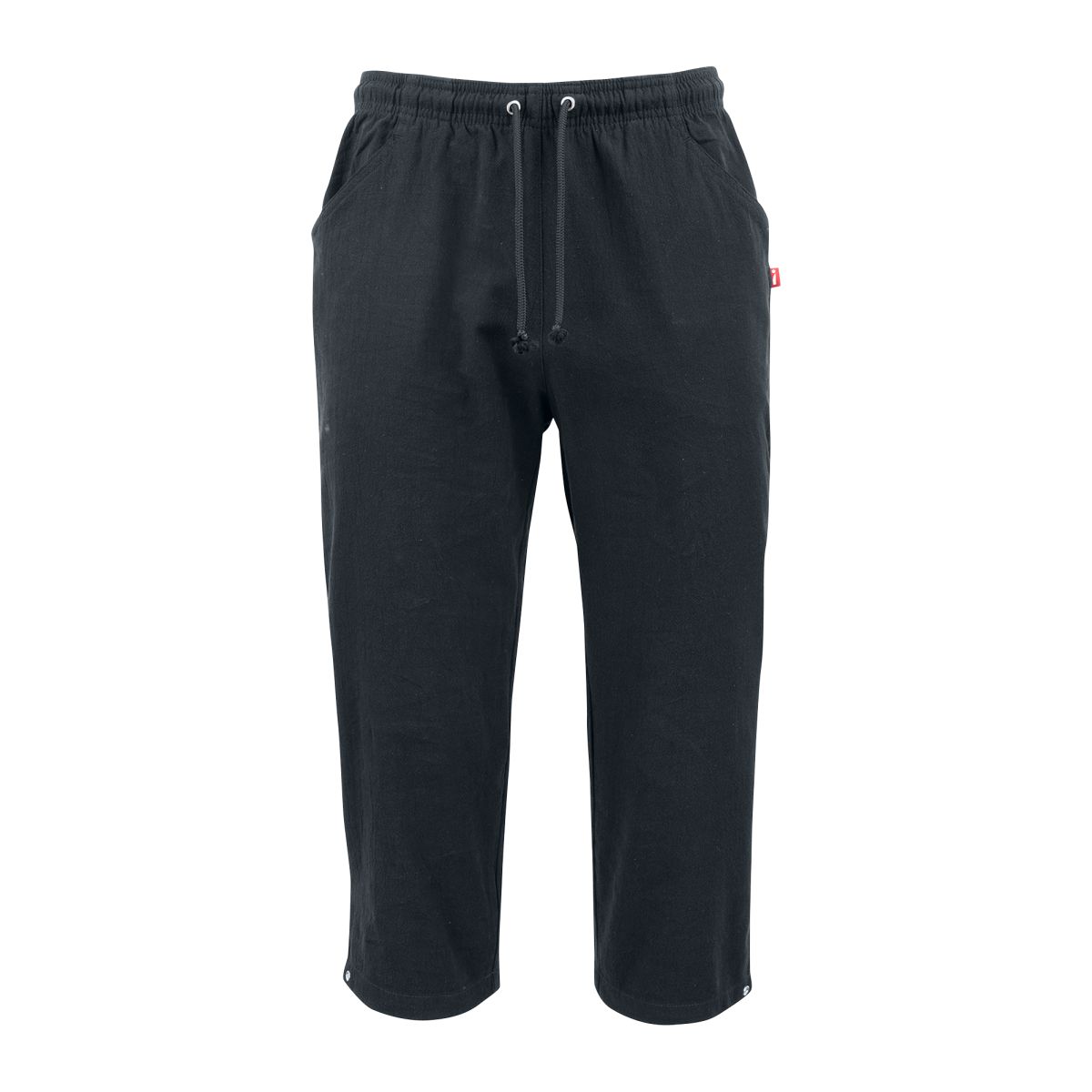 Cid Trousers, Black (001) Unisex-caprihousut. Tilava ja mukava malli, jossa vyötäröllä kuminauha ja nyöri. Edessä tilavat sivutaskut. Lahkeen leveyttä voi säätää pyöreällä painonapilla.... Lue lisää