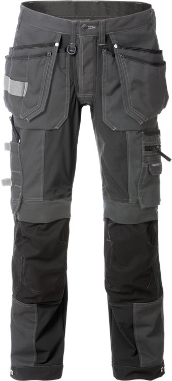Vahvasta ja kestävästä materiaalista valmistetut työhousut, joissa liikkumista helpottavat stretch-paneelit. Toimivat taskut ja ulkopuolella aukko polvisuojille.
