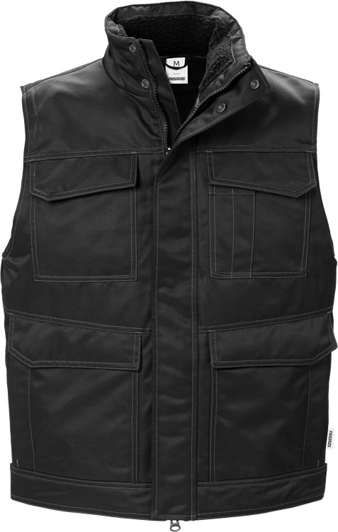 Likaa, öljyä ja vettä hylkivästä materiaalista valmistettu talviliivi, jossa tekoturkisvuori. Etuvetoketju ja painikkeet ovat peitetty naarmujen estämiseksi ja liivissä on pidennetty selkäkappale.