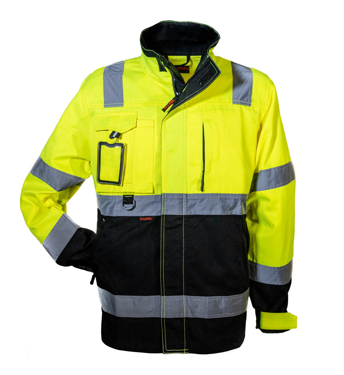 Huomiovärinen kesätakki, jossa yhdistyy kestävyys, toiminnallisuus, toimiva taskutus sekä erinomainen istuvuus. Tuote on valmistettu mukavasta sekoitekankaasta ja viimeistelty vettä ja likaa hylkivällä Teflon pinnoitteella. Kiristystarrat vyötäröllä ja hihoissa. Takaa pitenevä helma pitää selkäsi aina suojassa. Vetoketjulliset sivutaskut ja rintatasku. Irroitettava henkilökorttitasku.