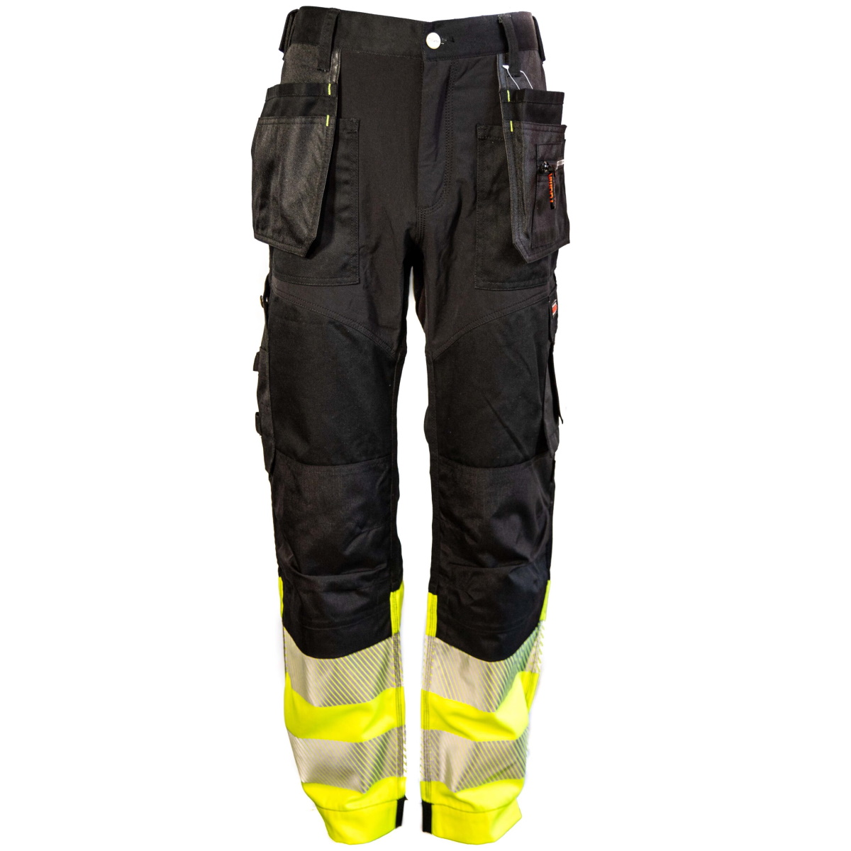 Tuuma malliston ylpeys. Nykyaikaiset riipputaskuhousut, jossa yhdistyy tyyli, istuvuus ja joustavuus. Joustava housut on valmistettu kestävästä ja miellyttävästä sekoitekankaasta ja siihen on yhdistetty joustavaa Stretch kangasta sinne, missä housun pitää joustaa. Riipputaskut edessä, joissa runsaasti yksityiskohtia. Vyölenkit. Reisitaskut sivuilla, joista toisessa puukon pidike. Tasku henkilökortille. Vyölenkit. Vahvistetut polvet, joissa taskut polvisuojille. Painetut, saumattomat katkonaiset heijastimet lahkeissa.